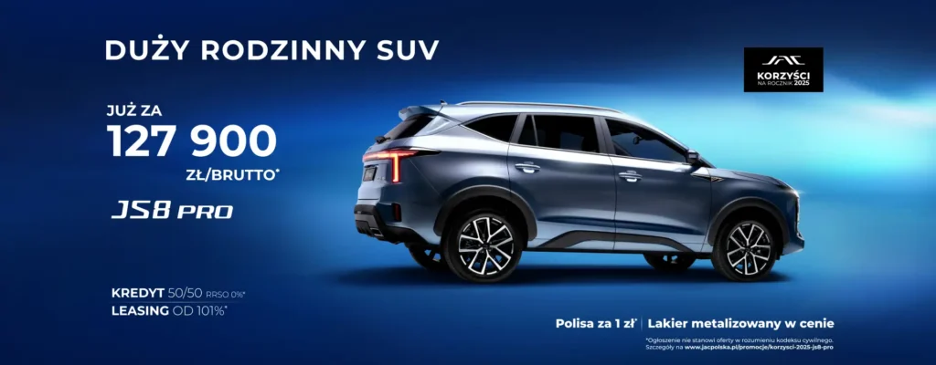 JAC JS8 PRO objęty jest 5-letnią gwarancją lub limitem 150 000 km na cały pojazd, co potwierdza wysoką jakość wykonania i niezawodność. Dodatkowo producent oferuje 3-letnią ochronę powłoki lakierniczej oraz 10-letnią gwarancję na perforację nadwozia.
